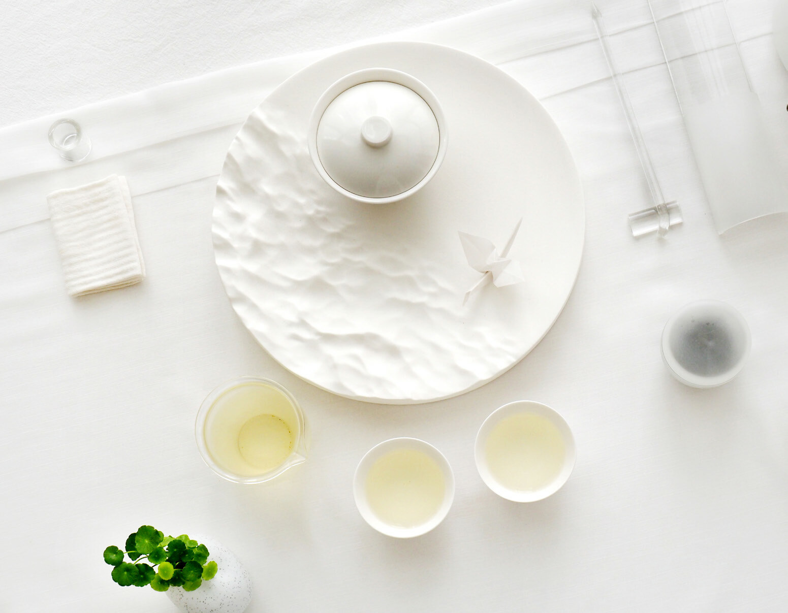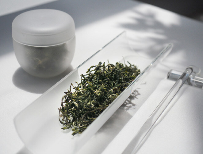 桌上的器物外型潔白簡約,然而靜下心來,細看之下卻會隨處可見白霧的影子。潔白的主泡台上雕刻著被白霧覆蓋的湖光山色,旁邊放著石頭造型的花器,花器上養著這春霧季節常見的小草。而磨砂材質的茶罐則若隱若現地透露著待會沖泡的茶品。