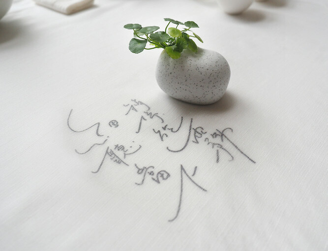 室友和你席地而坐在窗邊的矮桌前。幾幅白紗輕躺在矮桌上,堆疊成片片霧海意象。白紗鋪墊下隱約可見兩句你的手寫字:「稍停於霧 細聽當下」,細說著這次茶席的主題。